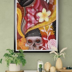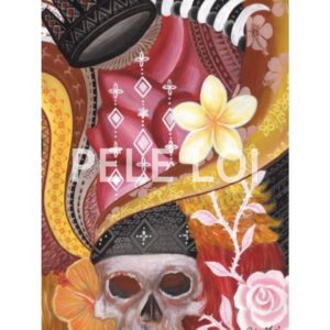 Pele paints a contemporary visualisation of icons of Samoan culture. The tanoa becomes a crown, a tuiga made of tatau symbols, flowing ribbons of elei, and flowers adorn a skull.