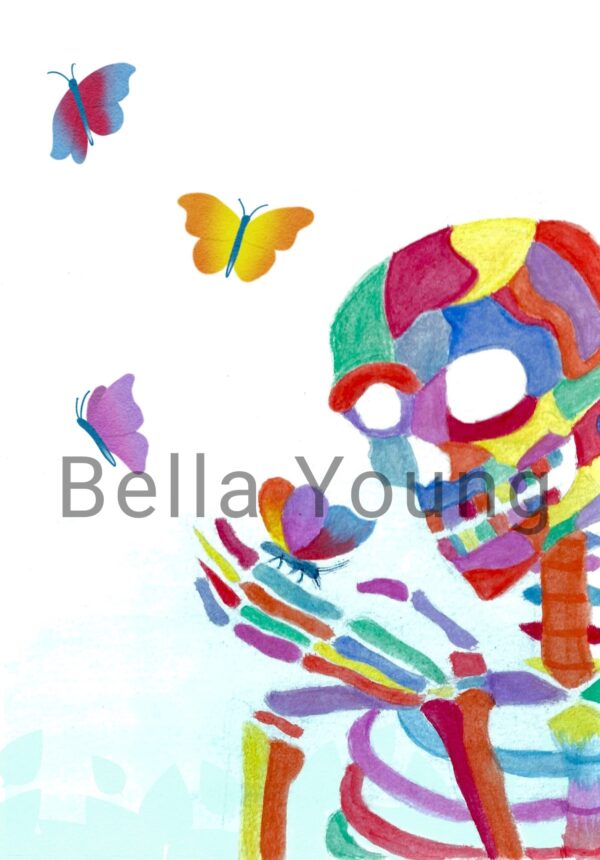 1. From her art series, “Butterfly and Bone”.  A mixed media artwork inspired by artist Bradley Theodore. Bella seeks to explore life and death using both digital artistry and traditional watercolor.