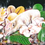 This print by To’a Sāleilua shows a steaming Samoan feast of pork, fish, breadfruit, taro and more, which are cooked using traditional methods.